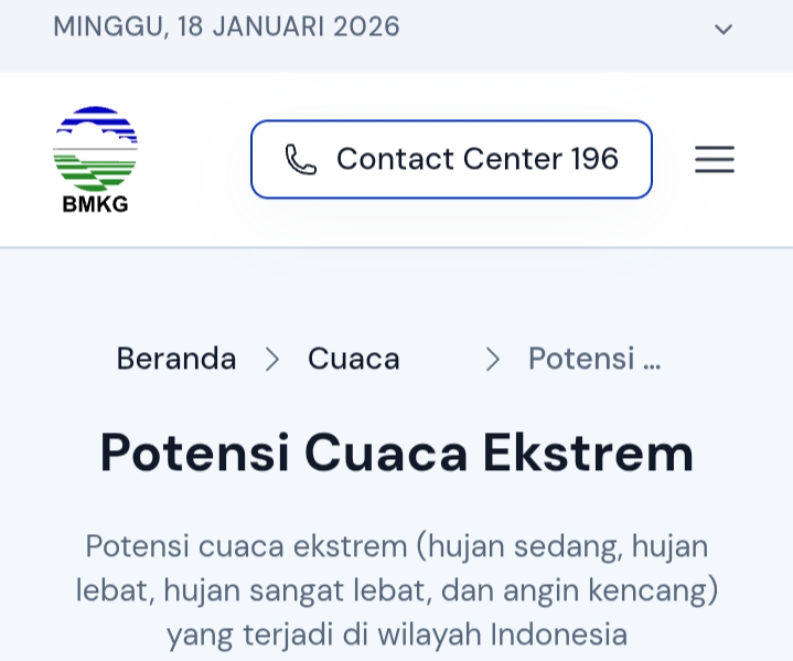 Badan Meteorologi, Klimatologi, dan Geofisika (BMKG) mengeluarkan peringatan dini cuaca ekstrem untuk periode 18–19 Januari 2026. Dalam dua hari tersebut, sejumlah wilayah di Indonesia berpotensi mengalami hujan sedang hingga sangat lebat yang dapat disertai angin kencang, sehingga masyarakat diimbau meningkatkan kewaspadaan.