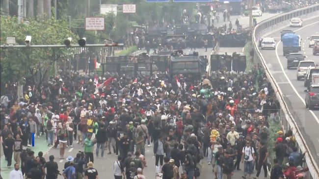 Kantor berita Antara melaporkan massa dari berbagai elemen masyarakat termasuk pelajar, terus mencoba merangsek ke Jalan Gatot Subroto untuk menuju ke depan Gedung DPR pada Senin sore.
