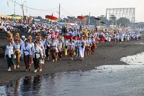Sejak pagi hari, umat Hindu datang beriringan dari pura dan desa adat masing-masing dengan membawa pratima serta berbagai sarana upacara menuju bibir pantai.