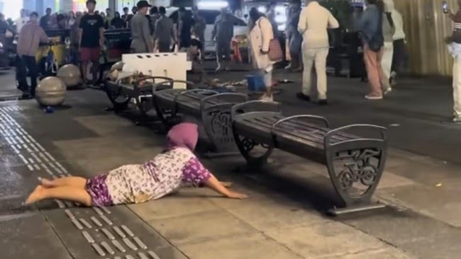 Melihat dagangannya tumpah, pedagang sate tersebut sontak histeris dan berguling di pedestrian sebagai bentuk luapan emosi atas musibah yang dialaminya.