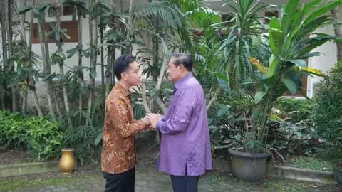 Begitu bertemu dengan SBY, Gibran yang datang berbalut kemeja batik warna cokelat dan celana hitam langsung bersalaman serta berbincang langsung dengan SBY yang tampak segar dalam balutan kemeja batik warna ungu.